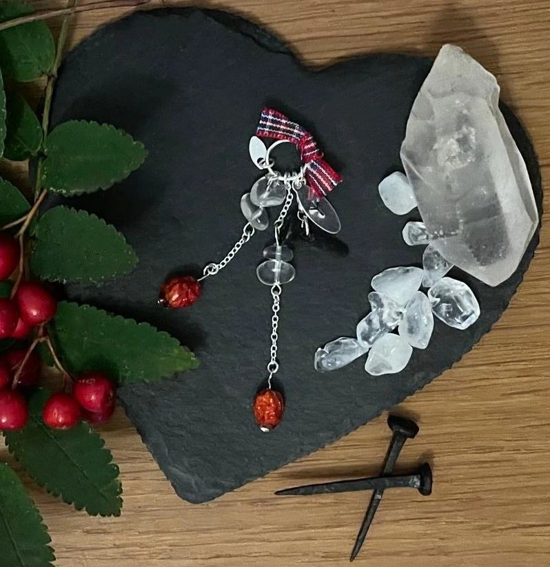 I am making handcrafted protection charms, steeped in Scottish folklore. Each piece combines the power of nature and craft: rowan berries gathered under a full moon, iron blacksmith nails forged to ward off harm, and clear quartz to magnify the magic within, bound together with sterling silver. A limited edition of twenty, made with intention and magic.
